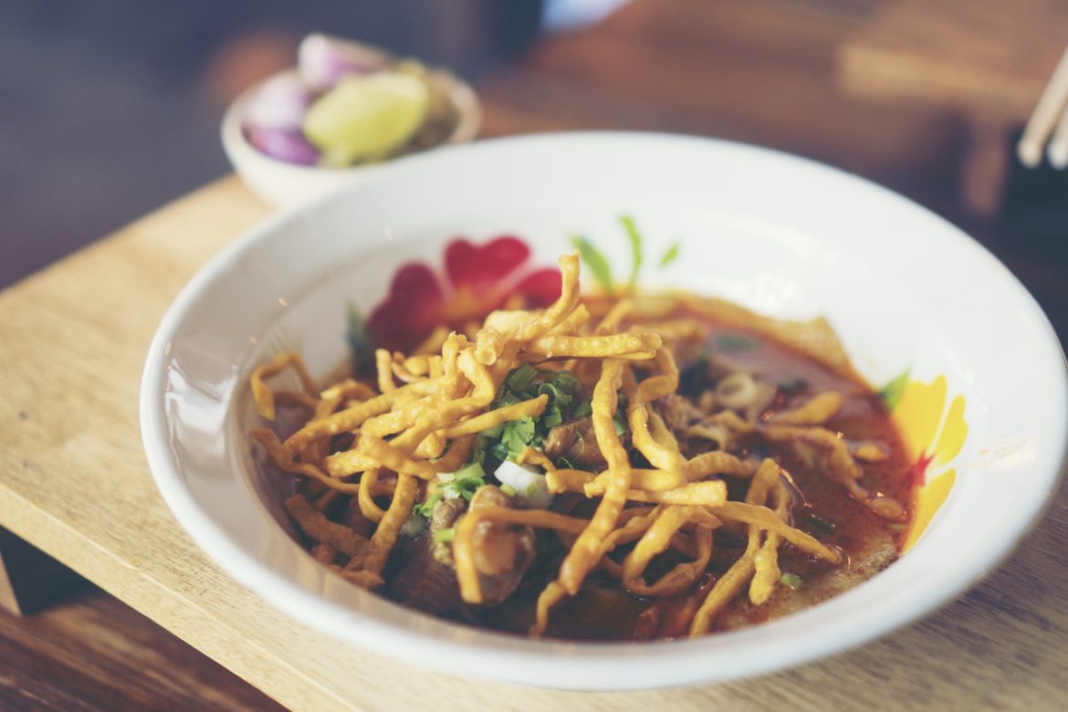 Le Khao Soi, un curry jaune crémeux parfumé au lait de coco, est servi sur des nouilles aux œufs avec du poulet, du porc ou du bœuf, et garni de nouilles croustillantes, de citron vert, d’échalotes et de piment. Parfaitement adapté au climat du nord, il reflète une fusion d’influences culturelles pour une expérience sensorielle unique.
